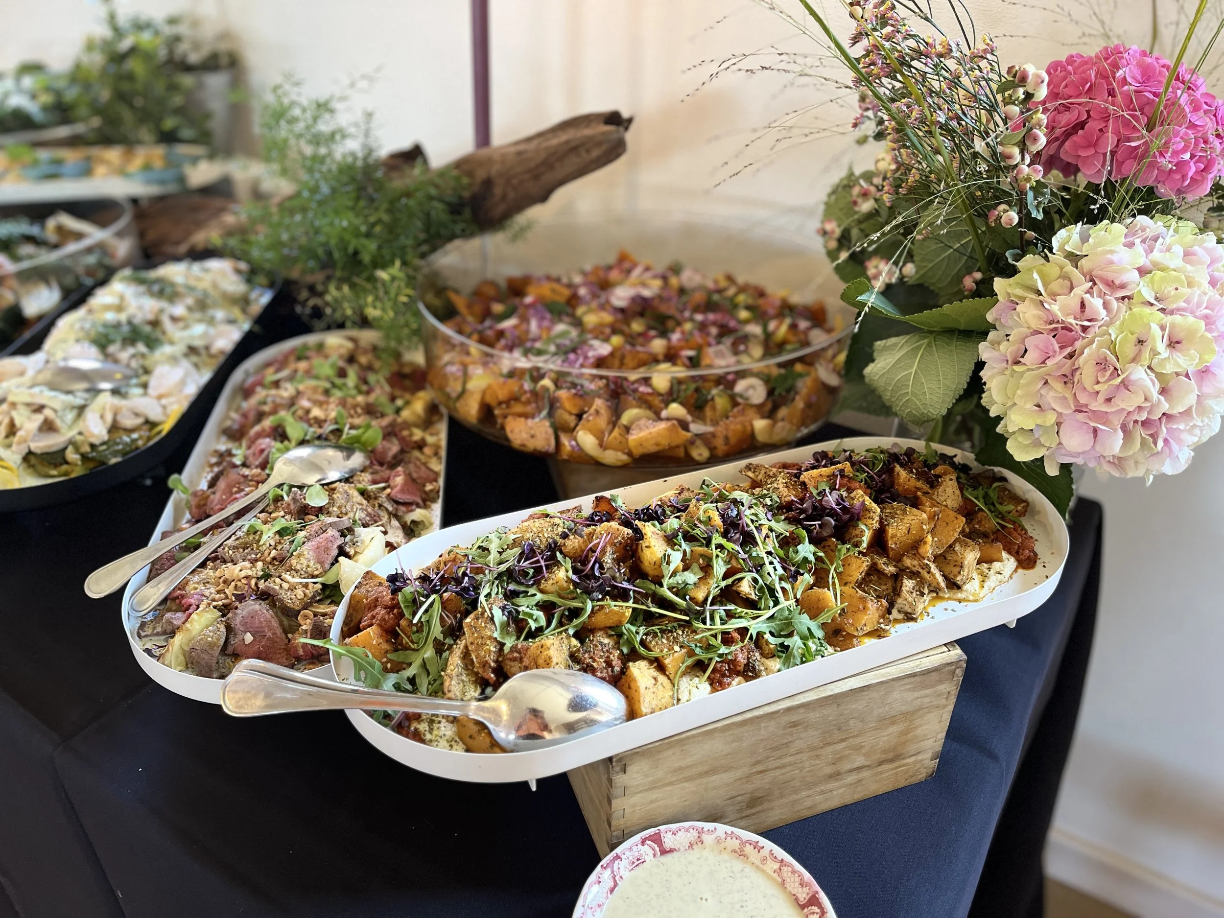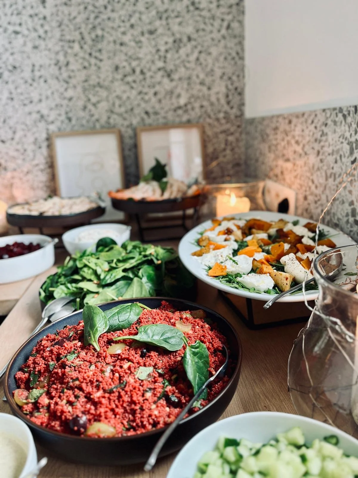 Buffet de plats froids cuisinés dans une optique healthy food inspirés par Ottolenghi. Un assortiment de plats de légumes et de viandes parsemés d’herbes fraîches et de saveurs originales.