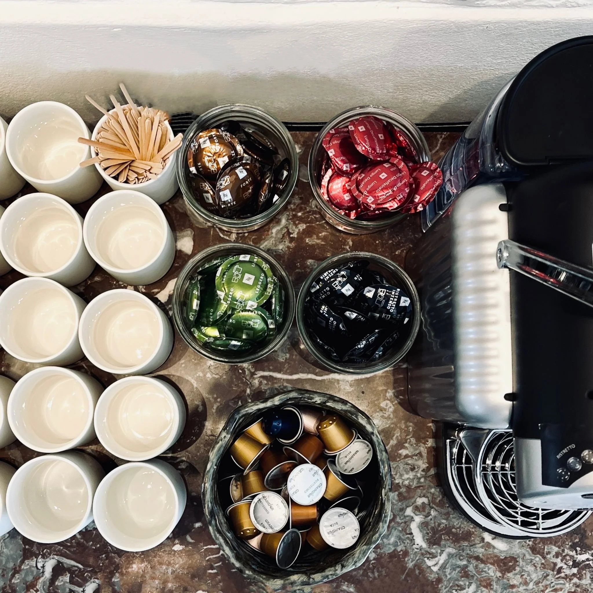 Nous mettons à votre disposition pour la journée un coin café Nespresso, assortiment de thés, eaux et jus.